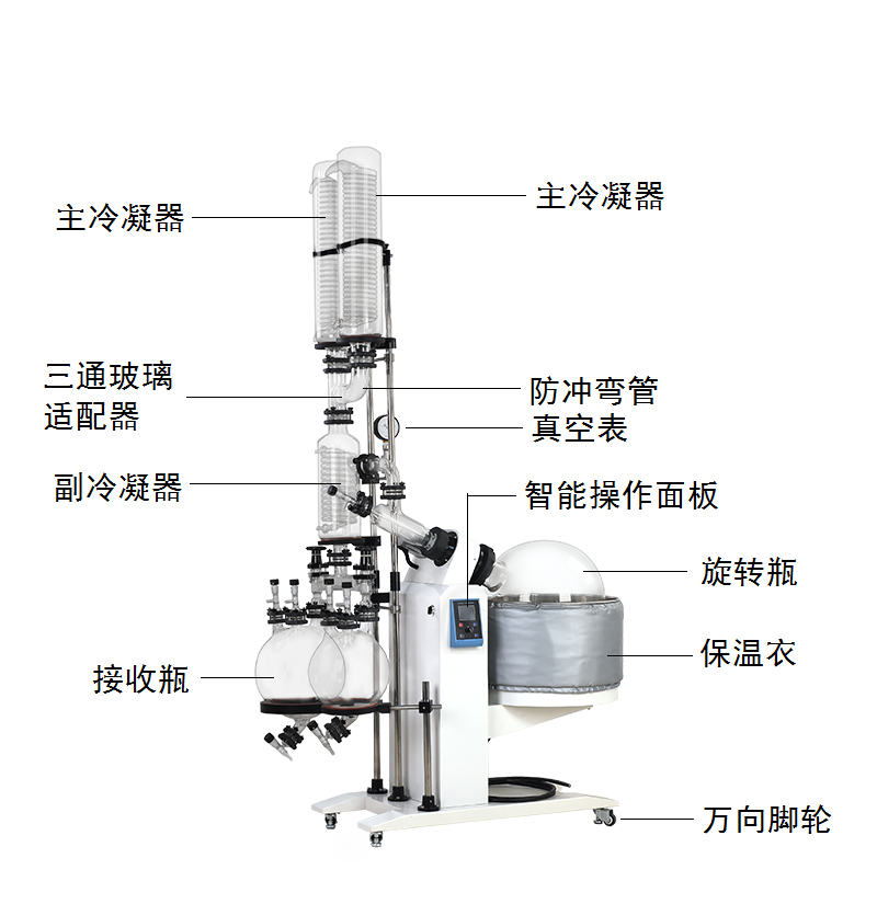 操作过程:可连续进料。真空系统装真空表,对低沸点物料可调节适宜的工作真空度。水浴锅电子恒温控制,水浴锅可电动升降。